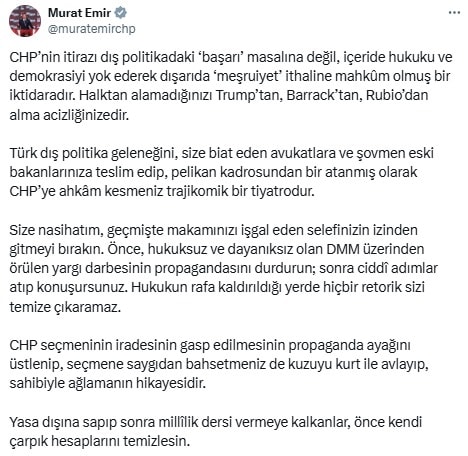 CHP’li Murat Emir resmi X hesabından yaptığı paylaşımında şu ifadeleri kullandı: