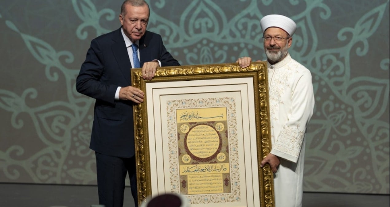 Ali Erbaş, Saray’da önceki akşam yapılan programın sonunda Erdoğan’a tablo ve kitap hediye etti.